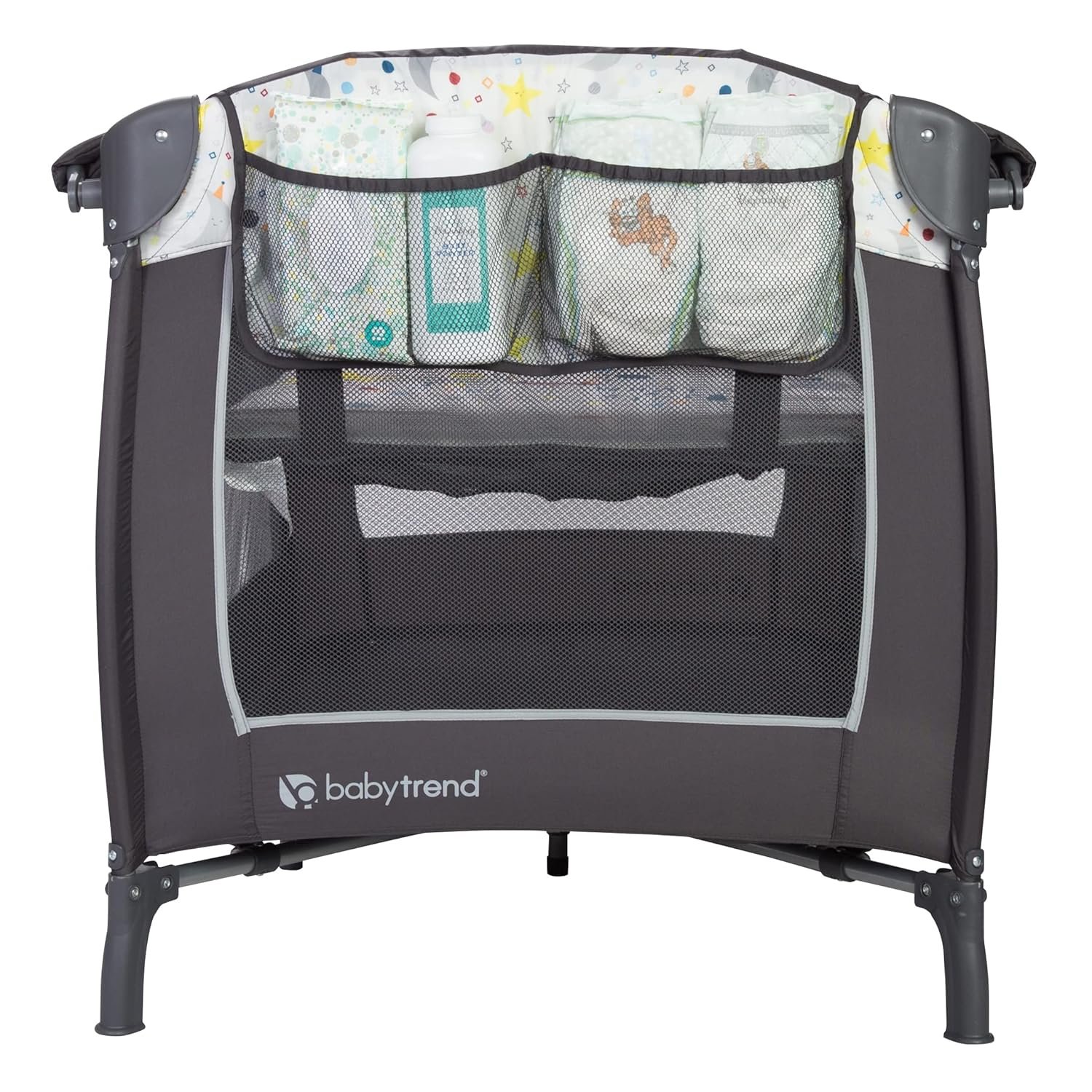 The convenient flip-away changing station makes diaper changes quick and organized. It includes side storage pockets to keep diapers, wipes, and essentials within reach. When not in use, the changer easily flips away, allowing more space for sleep or play.